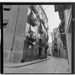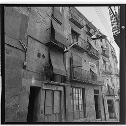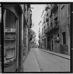 "Carrer de la Tallada. En primer pla es veu l’aparador de la pastisseria PRATS, al costat del número 27 del carrer, on va néixer el dibuixant lleidatà Alfonso LÓPEZ."