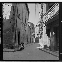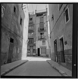 "Carrer de la Galera; al fons Cavallers; Rètol d’una botiga que hi diu “alpargateria” sabateria"