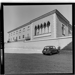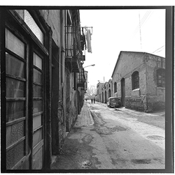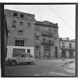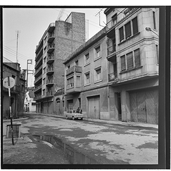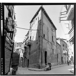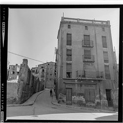 "Carrer de la Tallada, xamfrà Plaça de Sant Llorenç; a l’esquerra les ruïnes del Palau dels marquesos de la Tallada, antic Palau Episcopal; l’actual al fons"