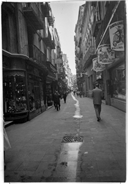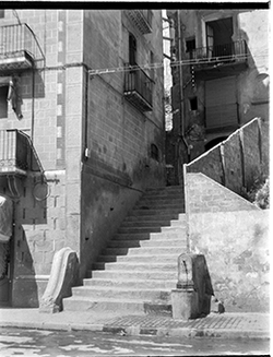 "Plaça de Sant Joan; escales de pujada al Carrer de Fragà; a l’esquerra, edifici de l'Hostal del Sol; en primer terme, una font pública"