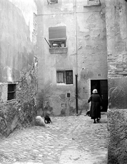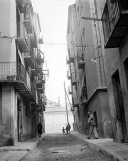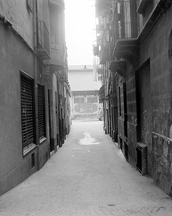 "Carrer Canonge González, xamfrà amb el Carrer Ballester; al fons els murs del Convent de Santa Teresa"