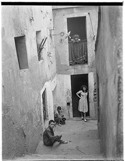 "Un racó del Carrer de la Vileta, possiblement; una nena petita asseguda en un esglaó del carrer"