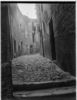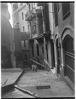 "Escales del Carrer Borràs; a la dreta, xamfrà amb el Carrer de Segarra (segons una placa a la paret); una dona gran baixa les escales"
