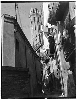 "Part alta del Carrer Nolius o La Rèdola (?); al fons el campanar de la Seu Vella"