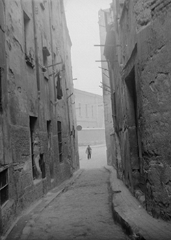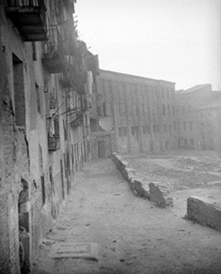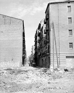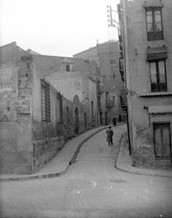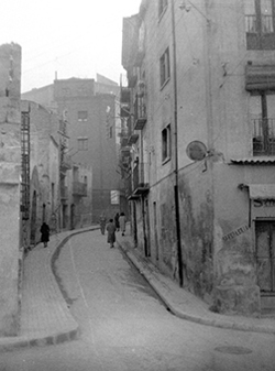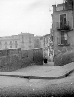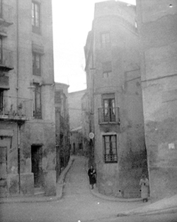 "Carrer del Joglar Segalà; a la dreta les ruïnes del Convent de l’Ensenyança; al fons l’edifici del Roser"