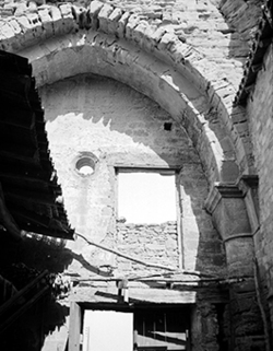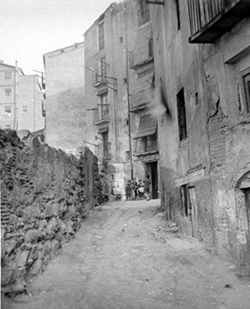 "Carrer del Joglar Segalà; a l’esquerra les ruïnes del Convent de l’Ensenyança"