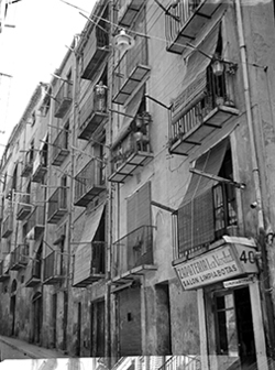 "Costa de la Magdalena; al fons el Carrer de la Parra; als edificis del fons hi ha roba abundant estesa als balcons"