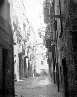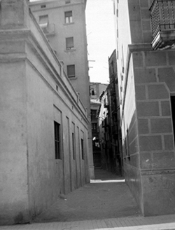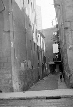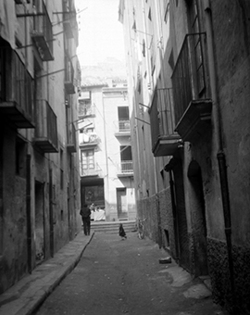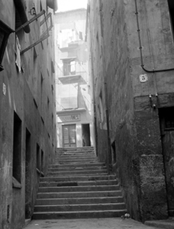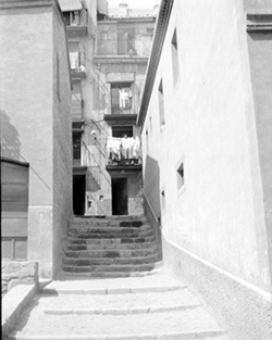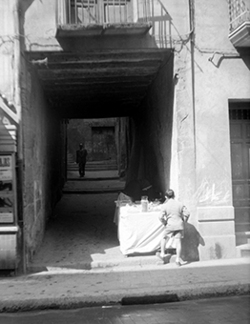 "Passatge de pujada al Carrer de la Botera, des del Carrer de la Magdalena; en primer terme, hi ha una parada de venda de gormanderies, el qual és observat per un nen"