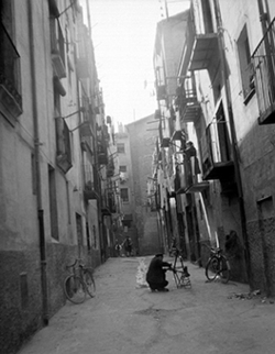 "Carrer de la Botera, des de la Costa de Magdalena, enmig del carrer, un home repara una bicicleta"