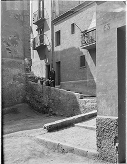 "Carrer Saporta, des del Carrer de Sant Martí; un nen mira la càmera; al fons, el vessant del Turó del la Seu Vella, i els carres Darrera de Sant Martí i Monterrey"