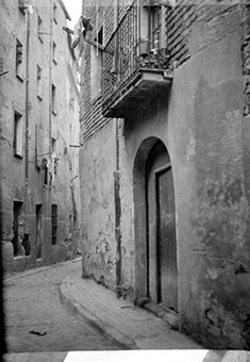 "Carrer de la Tallada, xamfrà amb el Carrer dels Boters i de la Galera; edifici del conegut Café Cuatro Esquinas"