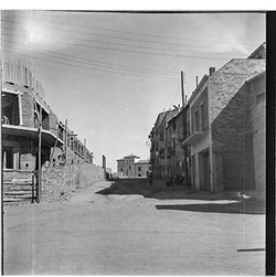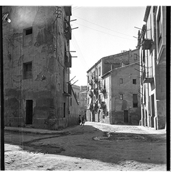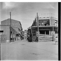 "Ronda de Sant Martí, des dels carrers Sant Carles (dreta) i Passatge Empordà (esquerra), on es veuen els blocs de la Diputació de Lleida en construcció; al fons, la caserna de la Policía Nacional (Policía Armada)"