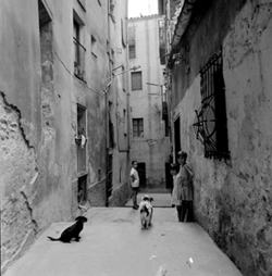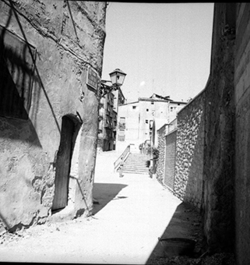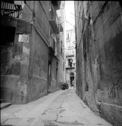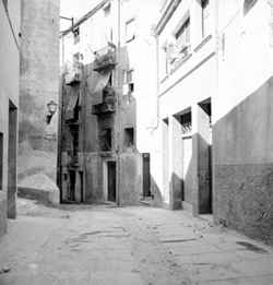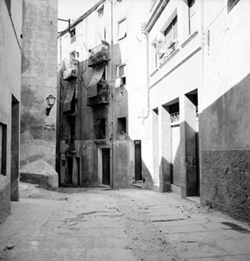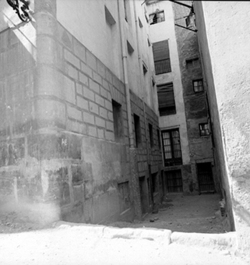 "Carrer Caldereries, inici del Carrer de Sant Domènec a l’esquerra; al fons el Carrer Cavallers"