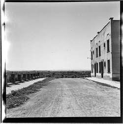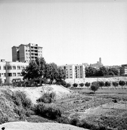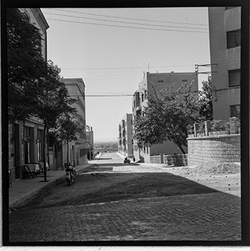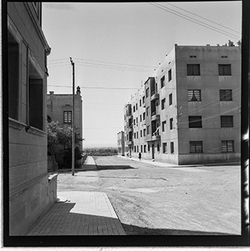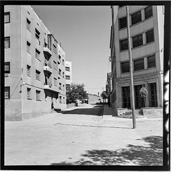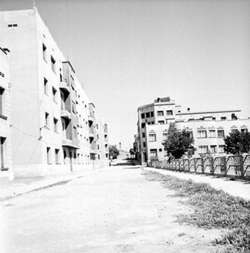 "Carrer Isaac Albéniz, xamfrà amb l'Avinguda de Madrid; al fons l'antiga Residencia de Oficiales , i els Blocs Militars"