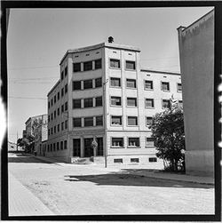 "Carrer Isaac Albéniz, xamfrà amb l'Avinguda de Madrid; a l'esquerra l'antiga Residencia de Oficiales , i els Blocs Militars"