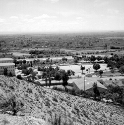 "Castell dels templers de Santa Maria de Gardeny; vista cap al sud-est; zona esportiva (Camp Escolar), l’Institut de Batxillerat Màrius Torres i el riu Segre."