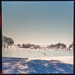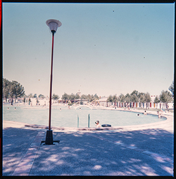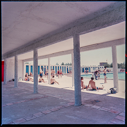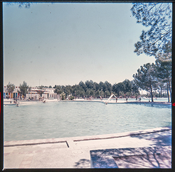 "Parque Municipal Alcalde Pons ; les Basses; porxo annex a la coneguda com piscina Deportiva , amb diversos banyistes, i les casetes - vestidors al fons"