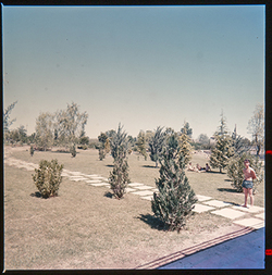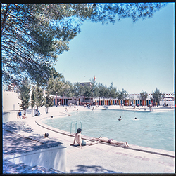 "Parque Municipal Alcalde Pons ; les Basses; piscina, jardins i bosc de pins; diversos banyistes prenen el sol"
