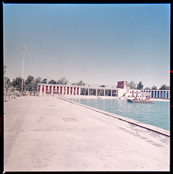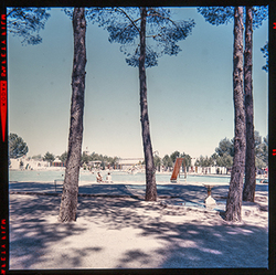 "Parque Municipal Alcalde Pons ; les Basses; porxo annex a la coneguda com piscina Deportiva , amb diversos banyistes"