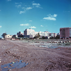 "Zona d’expansió del barri de Cappont; urbanització dels nous carrers al voltant de la nova Avinguda d'Alacant, i canalització de la Sèquia de Torres; al fons el Turó de la Seu Vella"